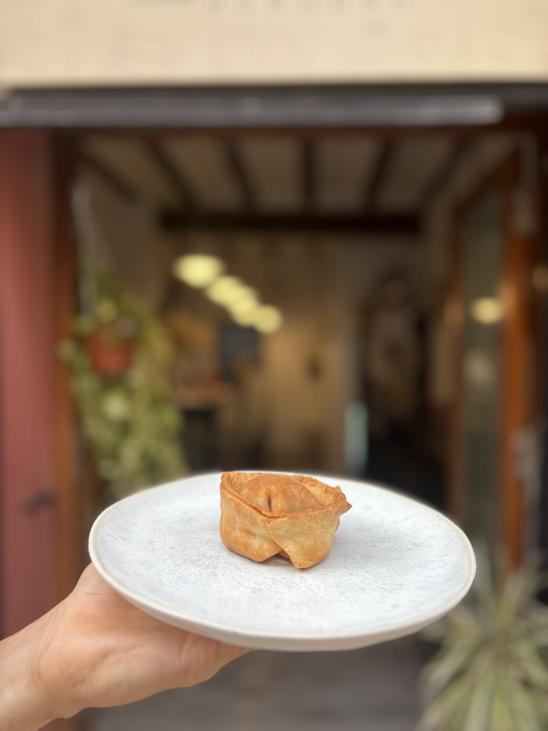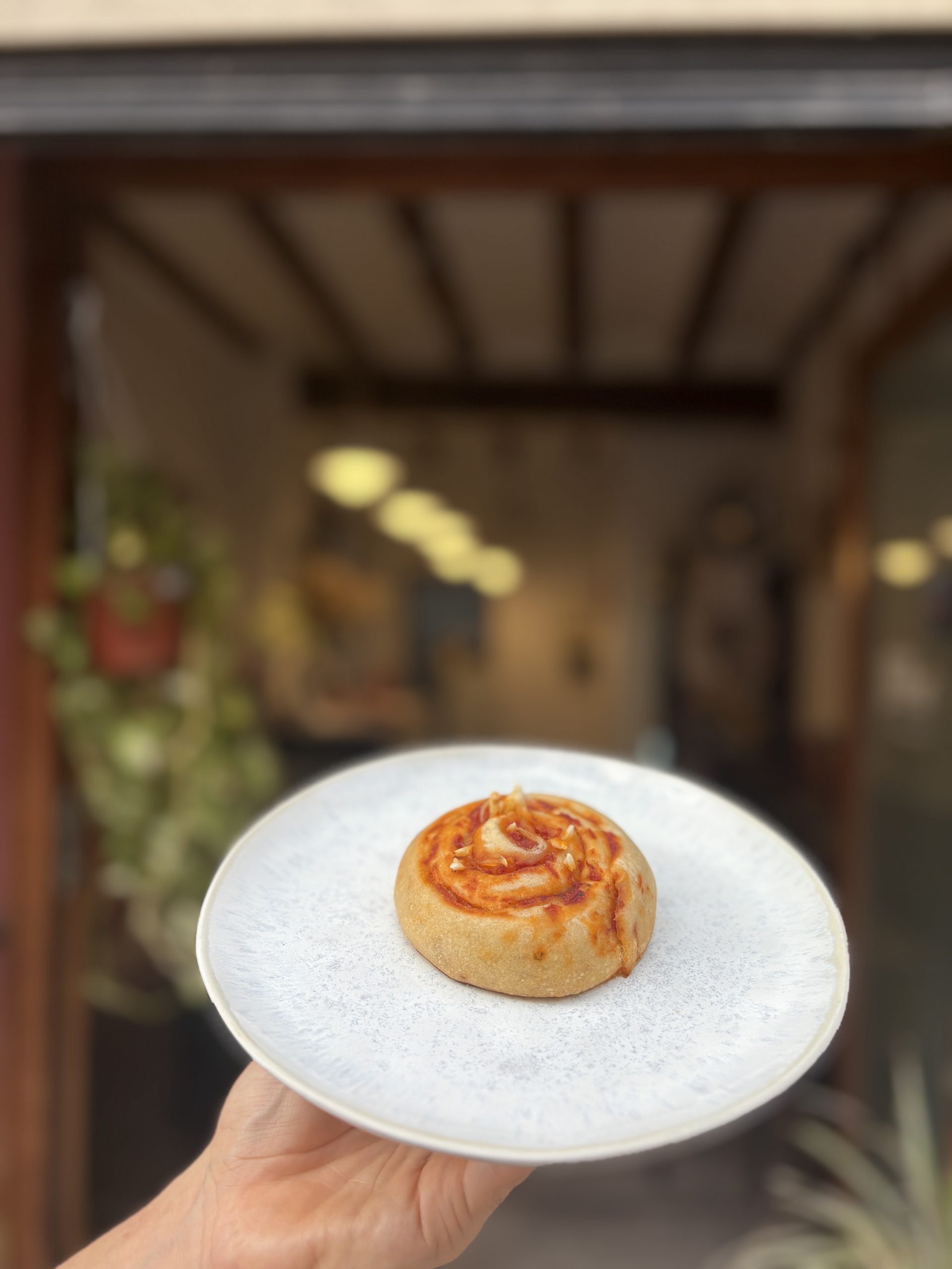 Masa esponjosa rellena de tomate, orégano y queso vegano fundido