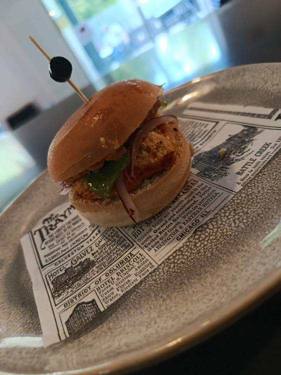 Mini burguer de coliflor con pesto rojo, rúcula y cebolla.
