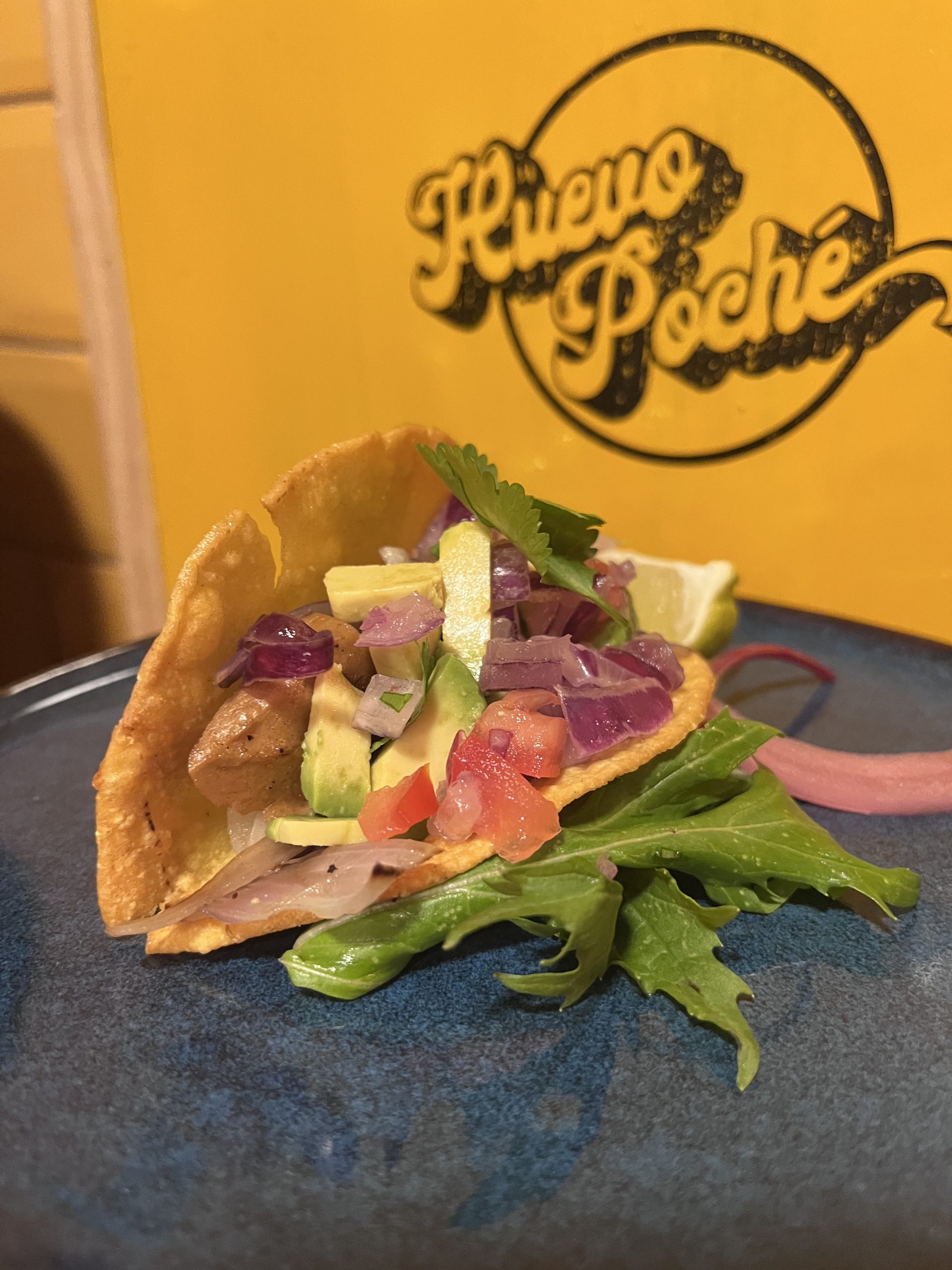 Ingredientes; tortilla de maíz crujiente, salteado de seitán con cebolla y champiñones con guacamole.