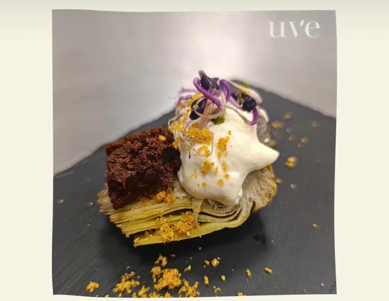 Alcachofa con sobrasada vegana cremita de coliflor y kikos