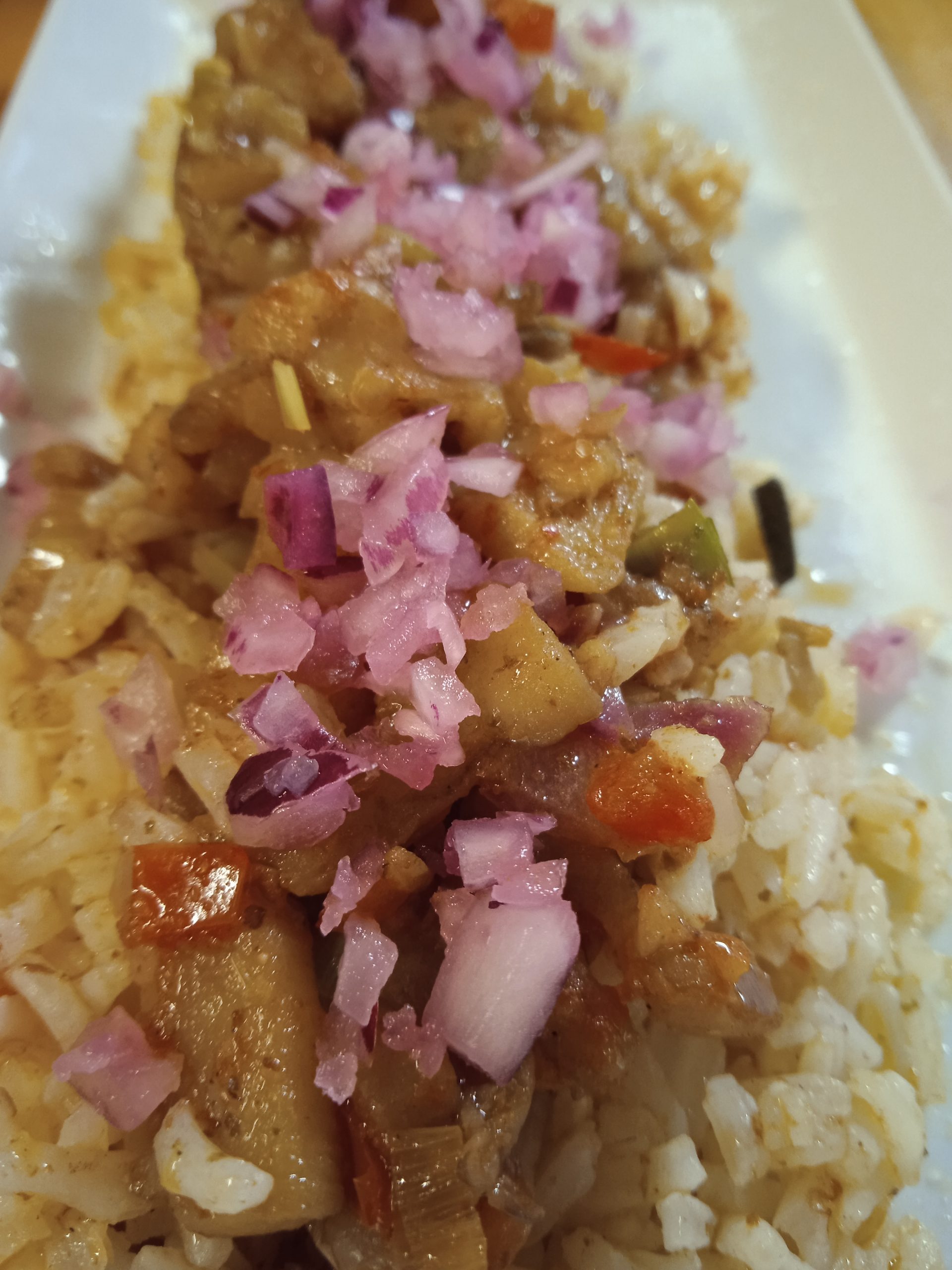 Berenjena jugosa salteada con arroz frito