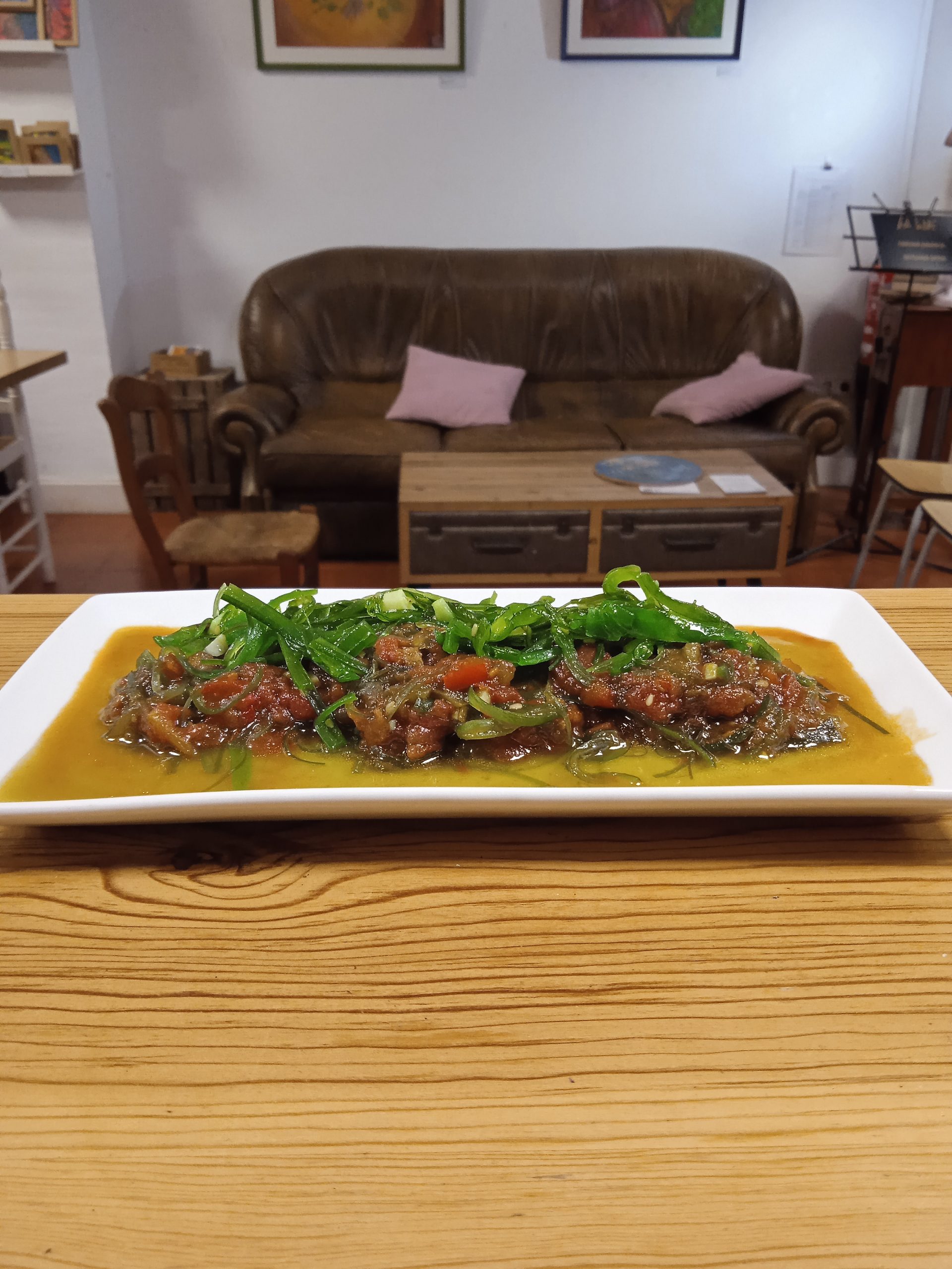 La titaina es un plato tradicional valenciano típico del barrio del Cabanyal. Nuestra titaina se caracteriza por las algas wakame que le dan un toque marinero que combina a la perfección con el resto de sabores del plato. El contraste de texturas es muy interesante pues combina el crujiente de las algas y piñones con la delicadeza del sofrito de tomate.