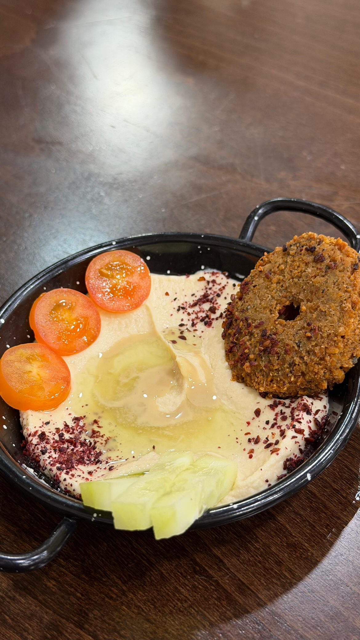 馃敻Base de hummus y rodajas de tomate y pepino, con uno de nuestras deliciosos falafel, todo esto aderezado con deliciosas salsas.