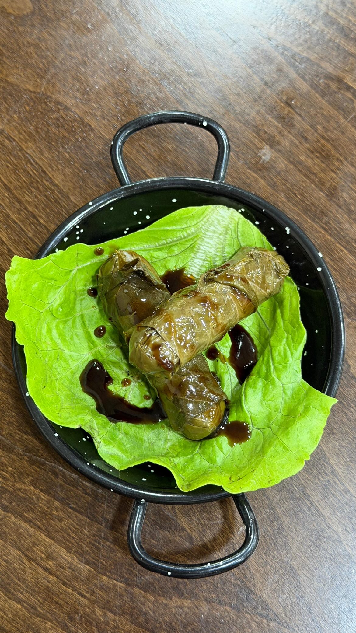 馃敻Dos rollitos de parra, rellenos de arroz perfectamente condimentados con especias 煤nicas, ba帽ados con una salsa de granada