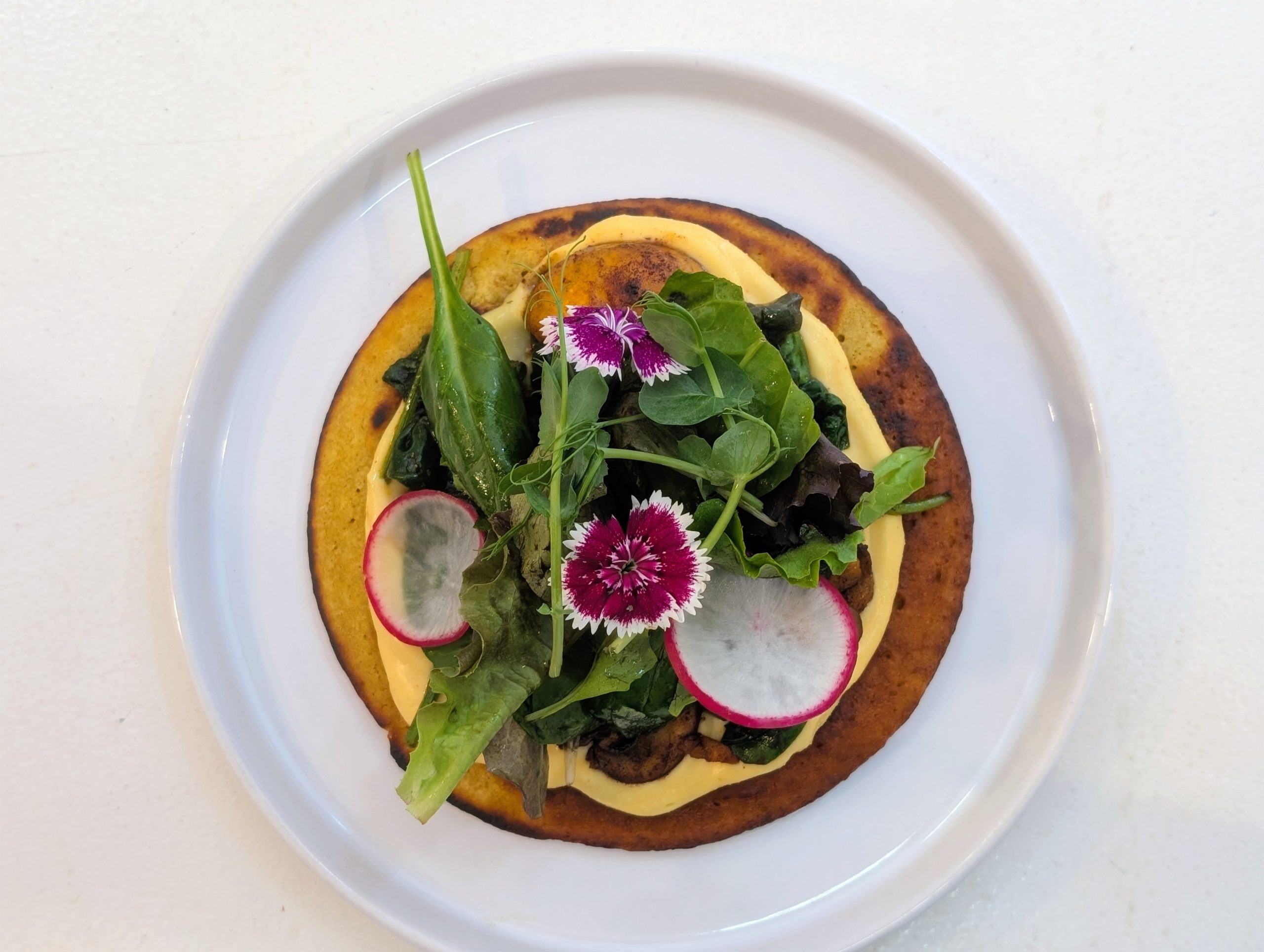 Tortilla de garbanzos, setas y espinacas salteadas, salsa de mostaza y mix de hojas