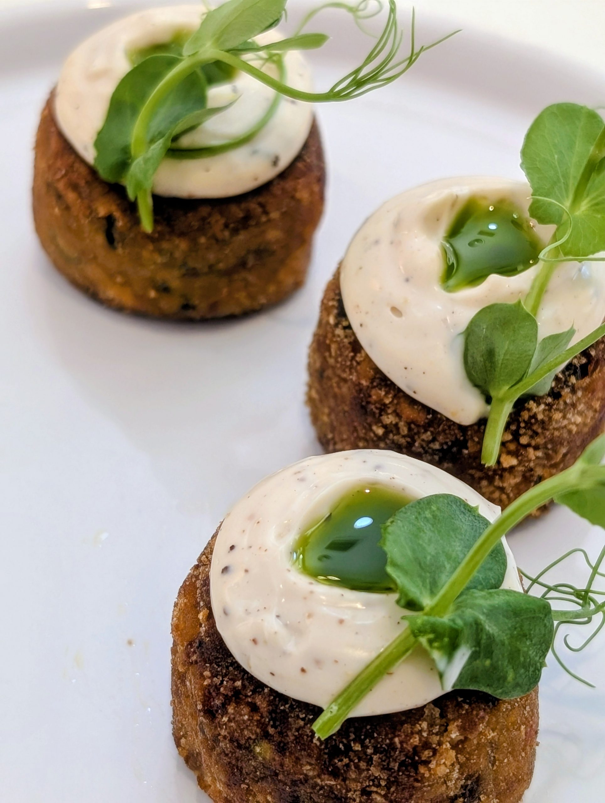 Bites de tofu con tomate seco y calabacín, salsa de pimienta negra y aceite de perejil