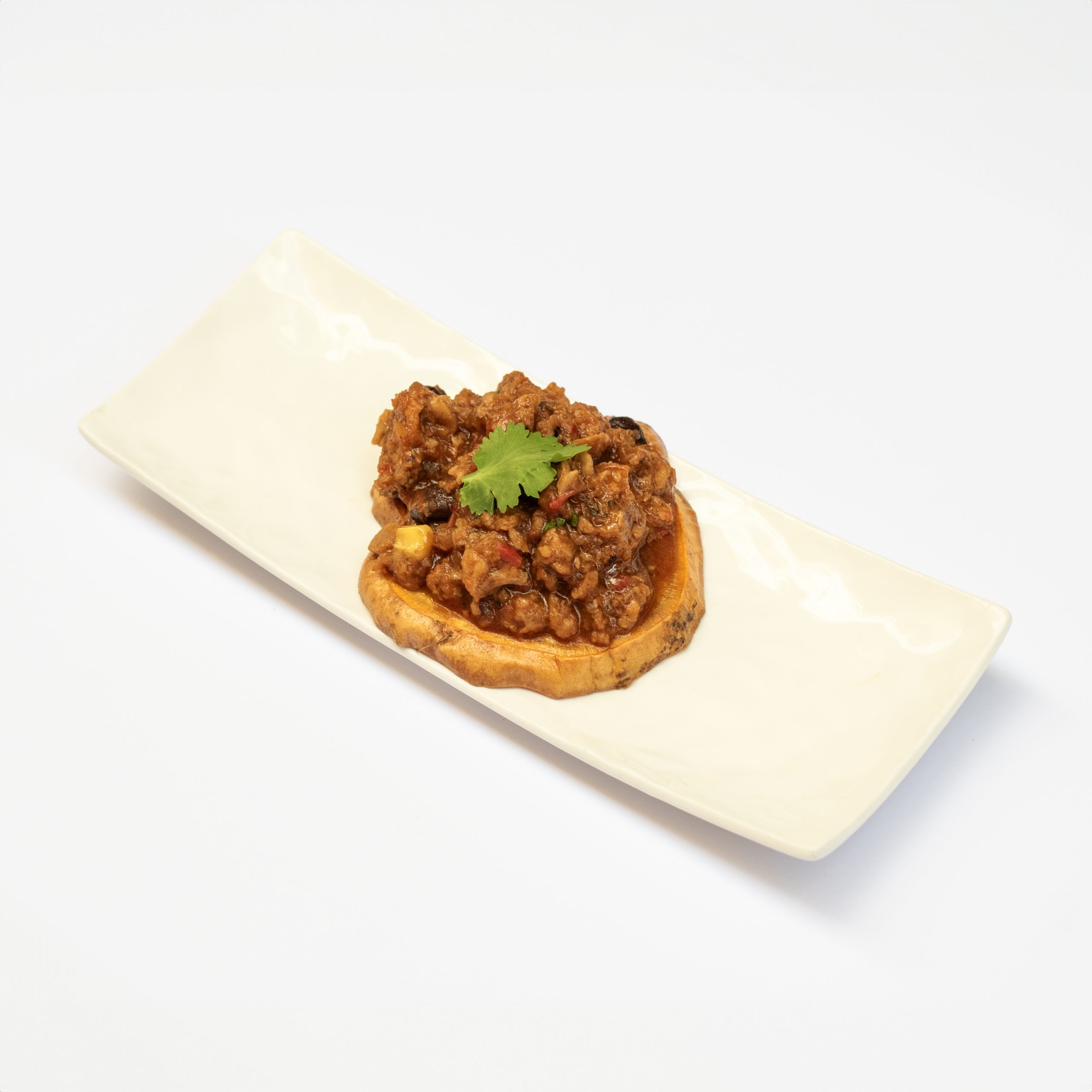 Chile de proteína de guisante, alubias y maíz servido sobre boniato rojo