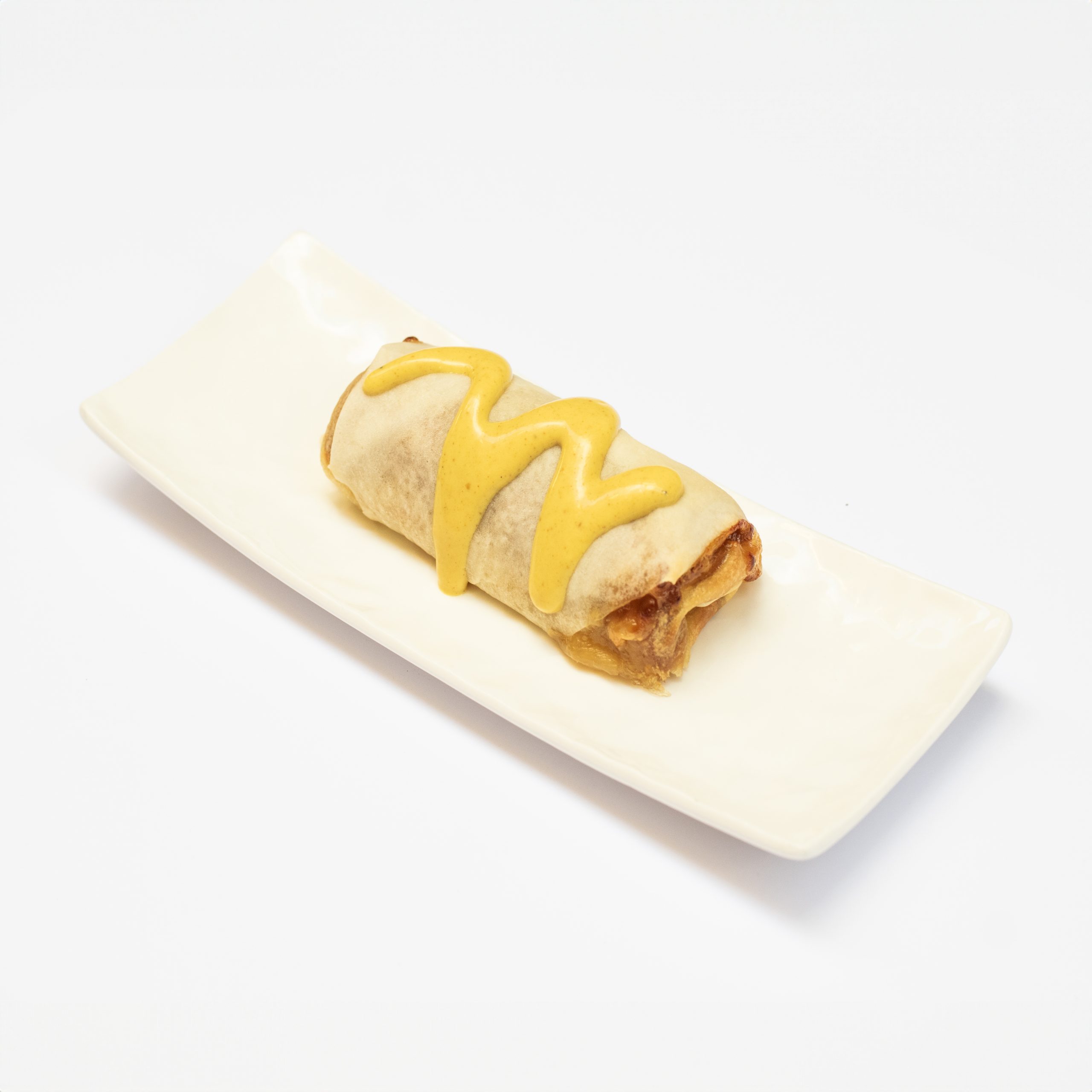 Rollito crujiente de queso vegetal y sobrasada de tomate semiseco y almendra Marcona con salsa japonesa de verduras asadas