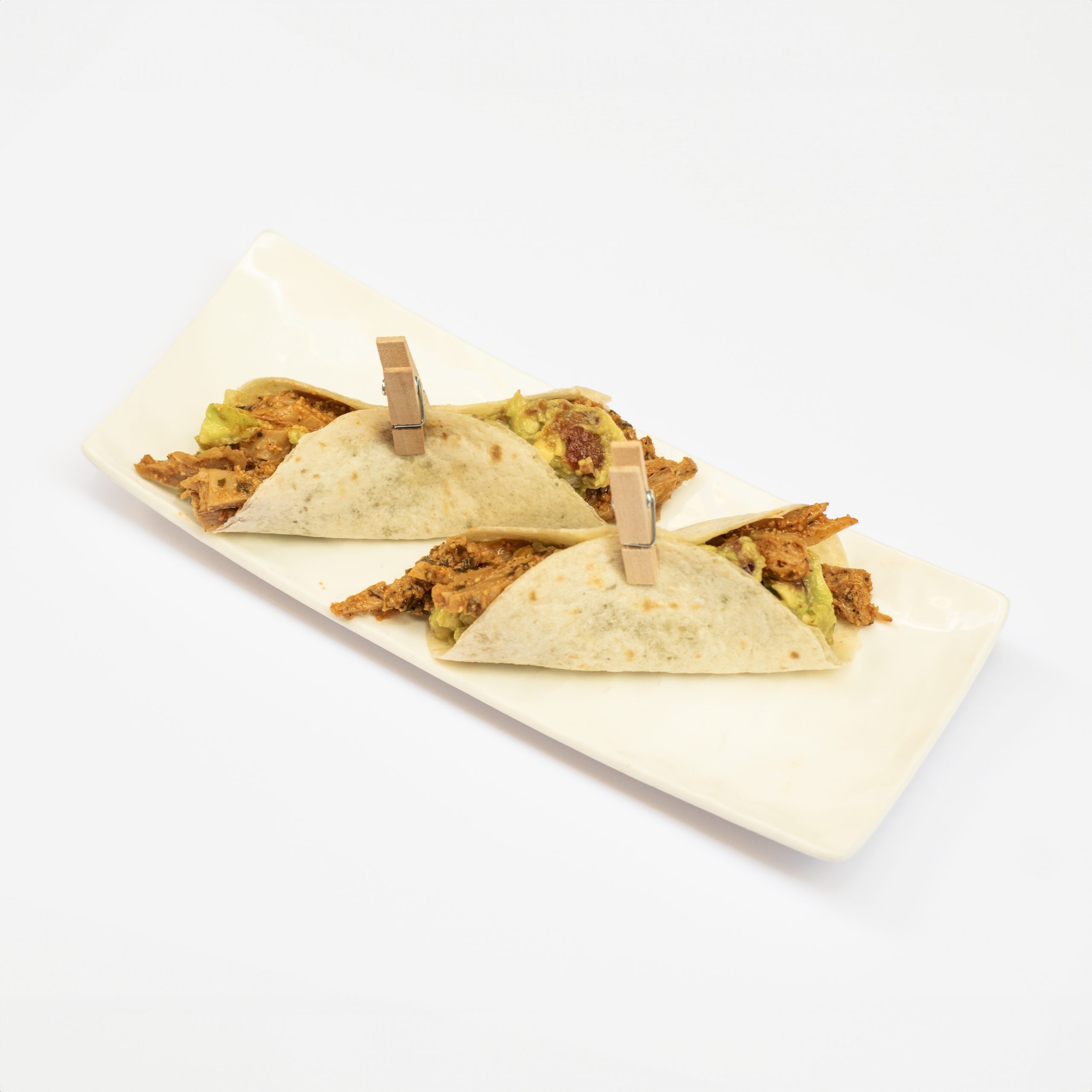 Taquito de pollo vegetal salteado con chimichurri y guacamole mediterráneo