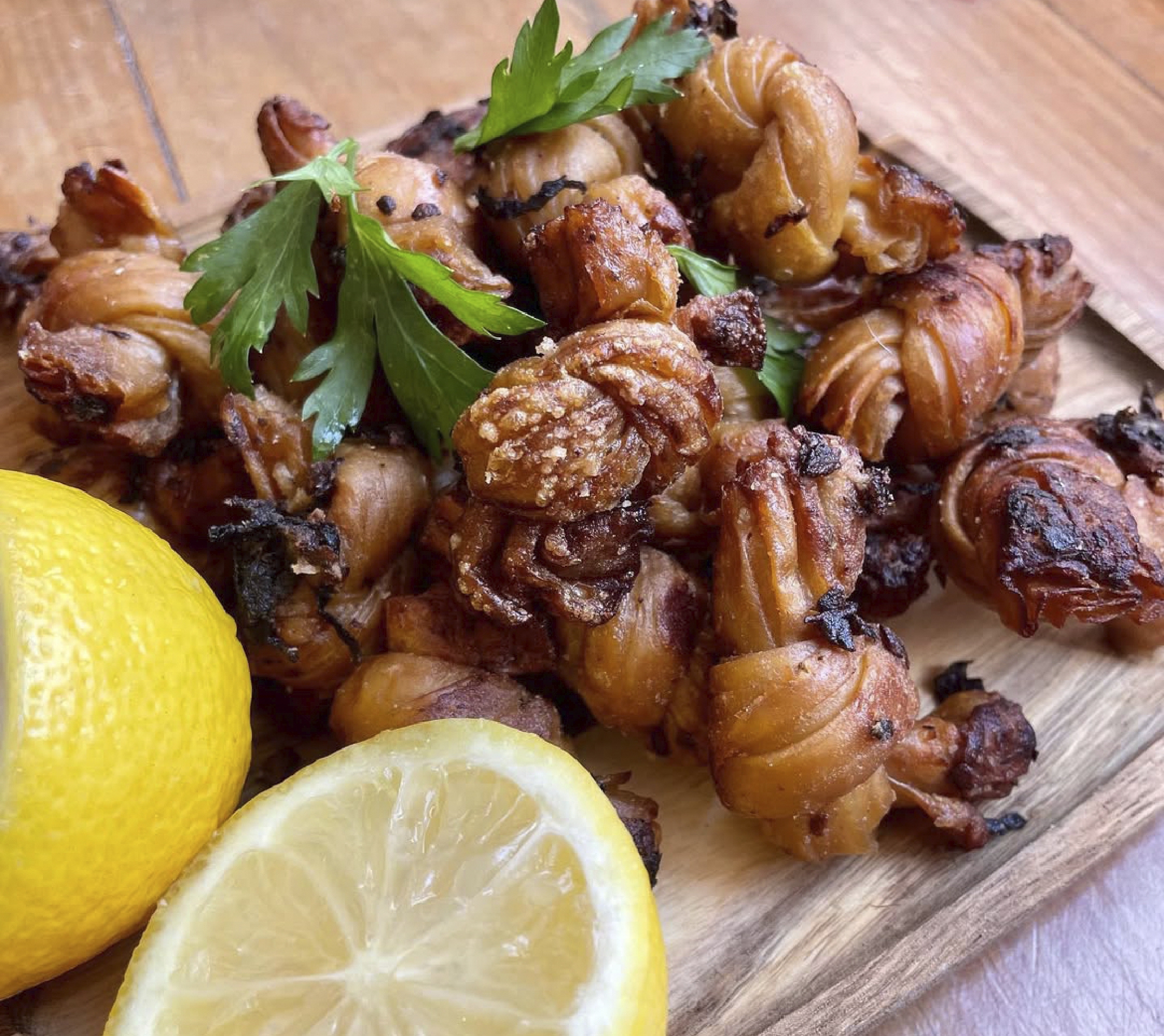 Lazos de yuba condimentados con algas y fritos al estilo andaluz