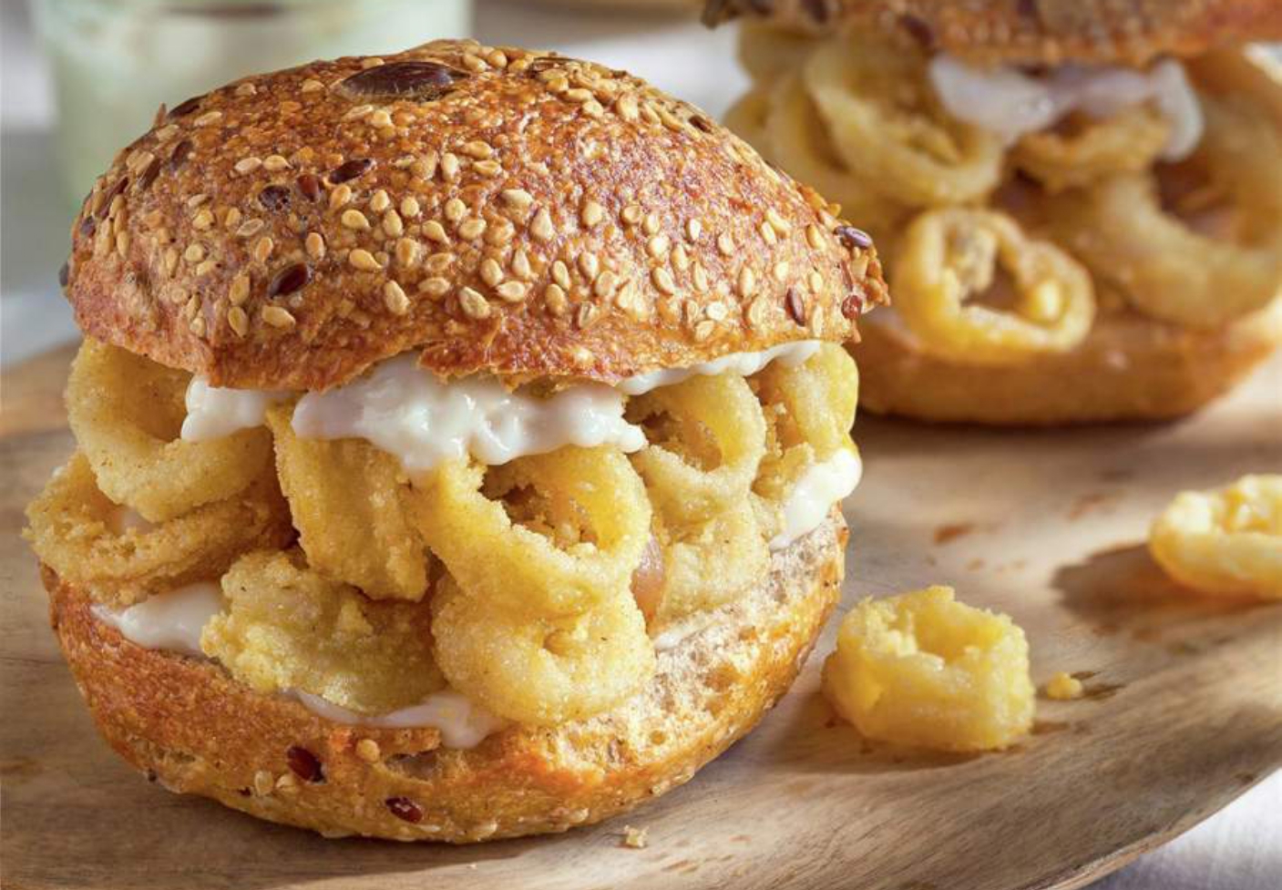 Pequeño bocadillito de calamares veganos a la romana acompañado de alioli